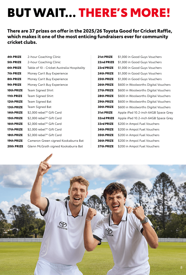 We’re thrilled to announce our participation in the Toyota Good for Cricket Raffle — a fantastic opportunity to support the Cannington Tigers Cricket Club while going in the draw to win amazing prizes!